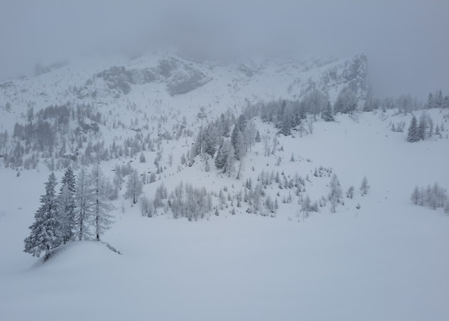 The weather was far from ideal throughout the whole stay, but it didn't stop us from skiing. In fact, we had some kind of mixed weather. It was mostly cloudy, a strong wind one day, the sun was shining from time to time, sometimes it snowed and sometimes a dense fog appeared. Anyway, the first two days we skied on Passo san Pellegrino.